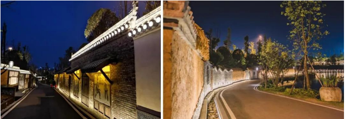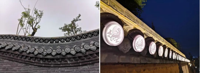 “岸桥楼树格局现”,通过对环湖、文化景墙、绿植以及湖心桥梁的统一打造,呈现出边界有韵、块面清晰的湖面布局;环湖景墙主要采用面光进行烘托,展示其体块或局部,尤其屋面和景墙立面部分作为重点元素,展现传统古典建筑曲度柔美的屋面以及富含历史感的立面,在具体的照明手法上,设计当中采用了瓦当灯与原瓦面进行融合,很好地刻画出传统建筑的瓦面细部特征,瓦当灯与白天景观形成一体,突出历史人文底蕴,另外在景墙与人行道路面间设置了隐藏灯具的暗沟,在保证灯光连续性的基础上,做到了见光不见灯的效果。