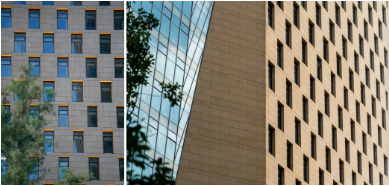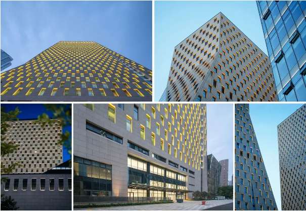 石材和玻璃幕墙的不同材质的通透质感和粗犷肌理对比形成特有的效果,摩登而又有序列,立体开窗风格呈现出韵律变化,与东南侧的来福士广场变化的立体面形成呼应。