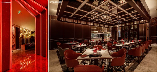 大方热烈的“中国红”配色基调延续至中餐厅,但在用光上更为克制和中性。光束集中投射于餐桌与立面相片墙,实现视觉引导功能。Ra>90的高显指光色还原美食本色,为宾客营造视觉盛宴;等待餐品时,宾客亦可追随光线至相片墙,领略佛山文化古城的风韵。