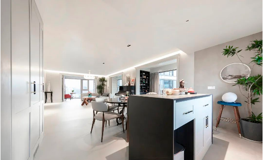 本项目位于南京下关,室内设计方案是业主设计的,业主本身不仅是一位出色的室内设计师,同时也是一名青年油画家。开敞的空间同时容纳了客厅、餐厅及西厨的功能,客厅、餐厅和厨房相连的空间模糊了功能的界限,使得家庭活动有了更多的可能性。