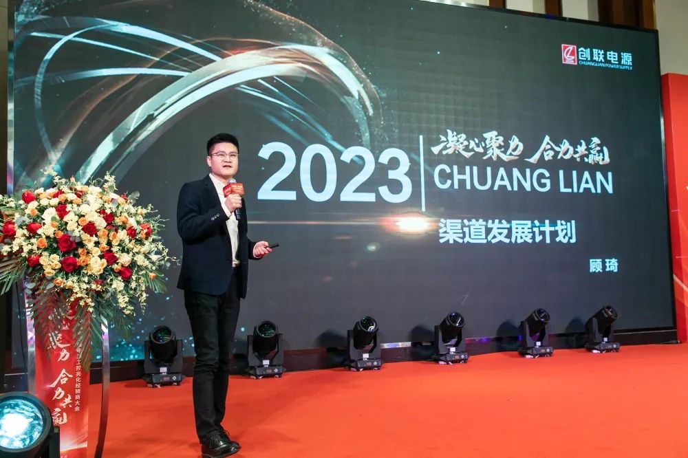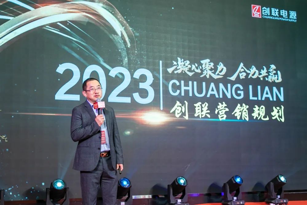 创联电源董事长唐景新先生、常务副总丁满凤女士、董事长助理唐诚先生、运营副总经理王学广先生、营销总监李建刚先生、市场总监吉玉金先生、工控亮化渠道总监顾琦先生、产品总监林万辉先生以及全国各地经销商代表共同出席大会。会议围绕“公司战略规划”、“公司营销规划”、“2023渠道发展计划”、“品牌规划及案例分享”、“新产品上市计划”、“运营配套支持”等角度展开全方位的深度解读。
