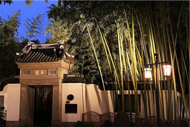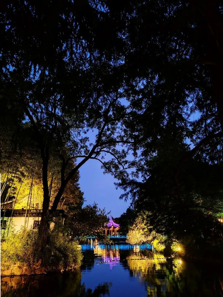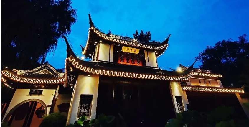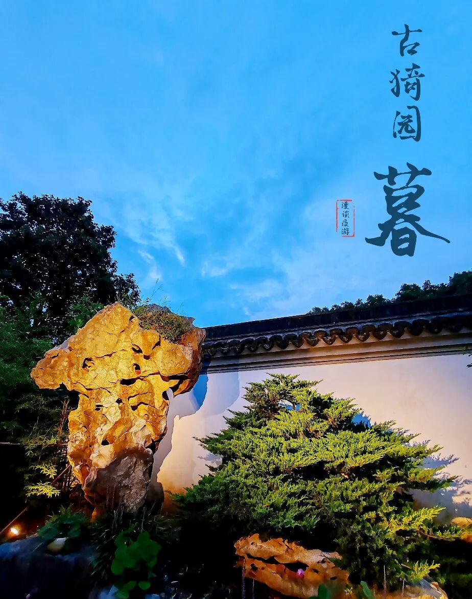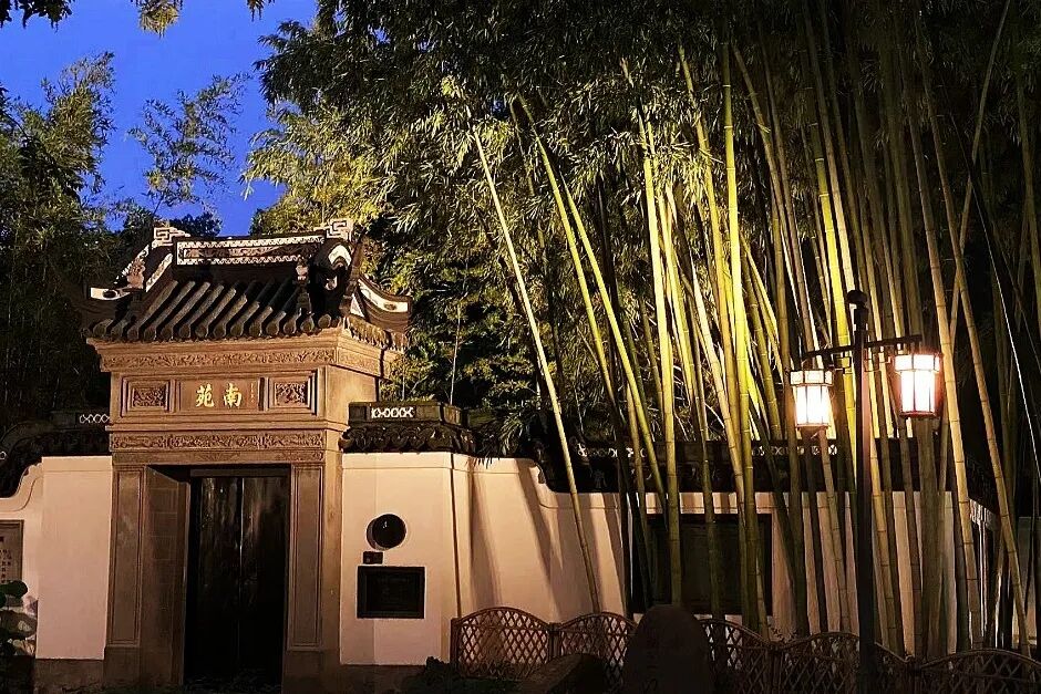 “古猗园”由园林设计、灯光艺术、文旅夜游跨界融合,匠心打造,园中夜景与建筑交相掩映。清代文人沈元绿的《古漪园记》点出园中主景:奠一园之体势者莫若堂,据一园之形胜者莫若山。