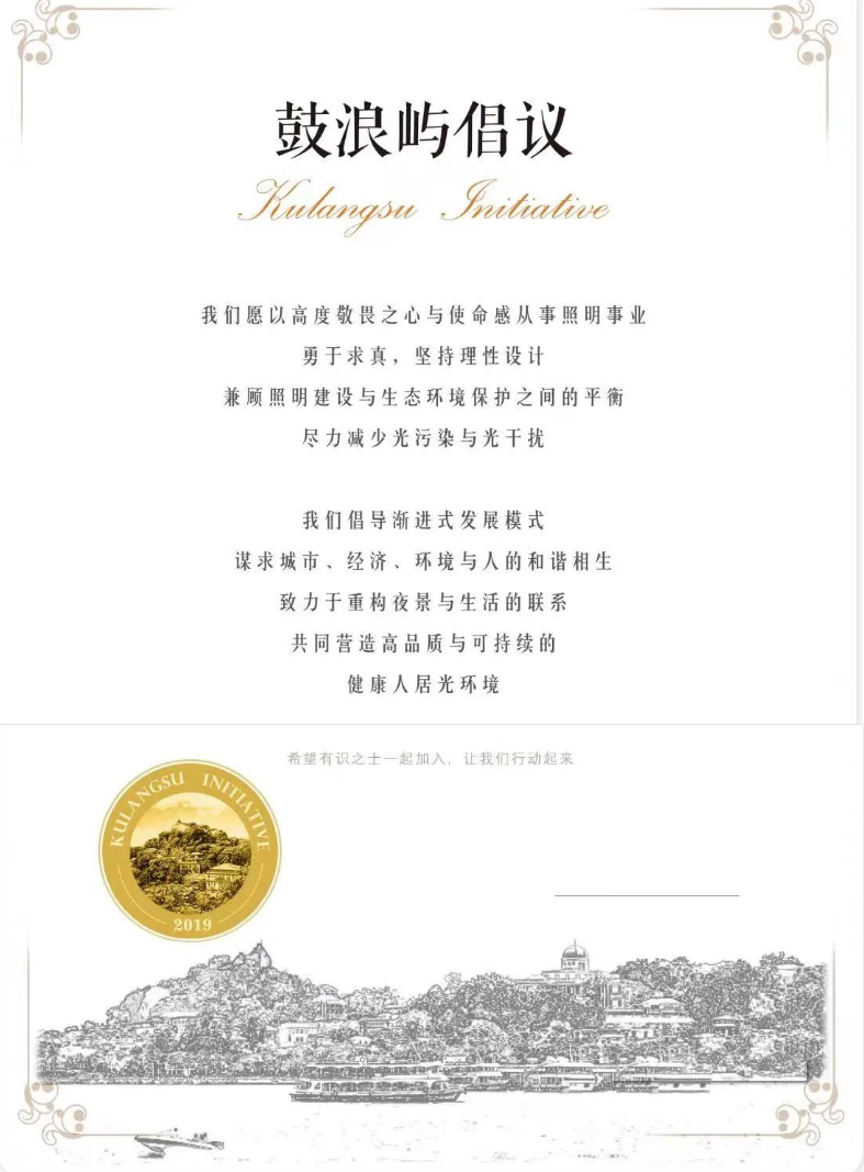 “鼓浪屿倡议”,是由四位精英设计师于2019年3月在厦门鼓浪屿沙龙中提出并在会后发布的倡议,倡导行业人士在照明设计与建设中谋求城市、经济、环境与人的和谐相生,致力于照明未来发展图景的探索与反思。