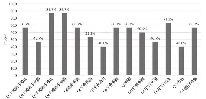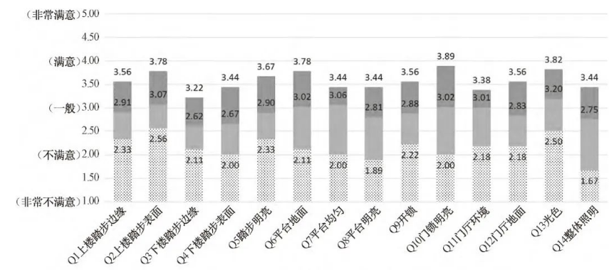 60岁及以上人群对平台地面识别及均匀性评价为一般及以下所占比例分别为53.3%和40%,从均值看为一般满意程度,明亮程度方面则所占比例更高,达到66.7%,调研中最小值甚至低于2分。由此表明,现状平台处的照明均匀性基本达到满意程度,然而照度水平还需提升。