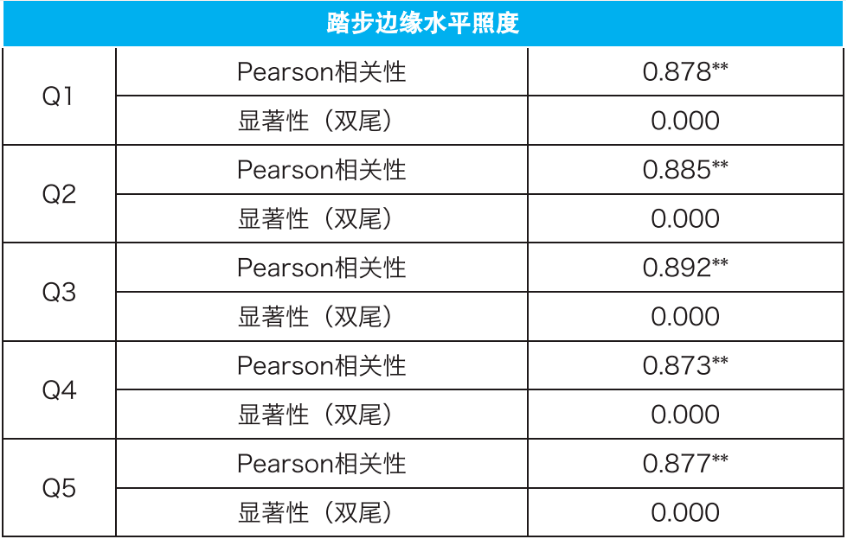将Q1~Q5与梯段处照明指标进行相关性分析(表7)。该人群上楼和下楼过程中对踏步边缘、表面情况识别及明亮程度的满意程度与踏步边缘水平照度的相关系数均大于0.8,呈高度正相关。