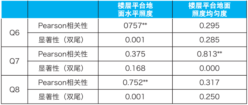 主观评价视看平台为楼层平台,将Q6~Q8与该处照明指标进行相关性分析(表8)。平台地面识别和明亮程度的满意程度与平台地面水平照度相关系数大于0.7,呈显著正相关。对于地面均匀度的满意程度与平台地面照度均匀度相关系数大于0.8,呈高度正相关。