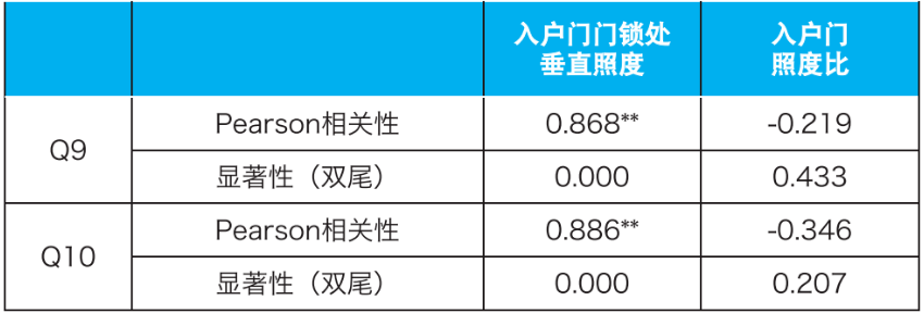 将Q9、Q10,与入户门门锁处照明指标进行相关性分析(表9)。对于门锁识别和明亮程度的满意程度与门锁处垂直照度的相关系数大于0.8,呈高度正相关。