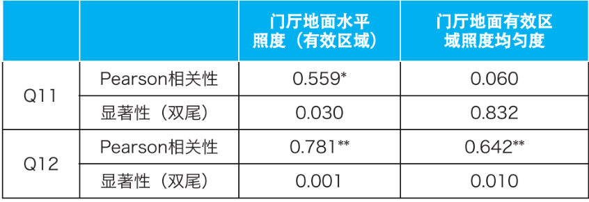 将Q11、Q12与门厅处照明指标进行相关性分析(表10)。门厅照明环境适应程度满意度与门厅地面水平照度(有效区域)的相关系数为0.559,呈显著正相关。门厅地面识别满意程度与门厅地面水平照度(有效区域)和门厅地面有效区域照度均匀度的相关系数分别为0.781和0.642,呈显著正相关。