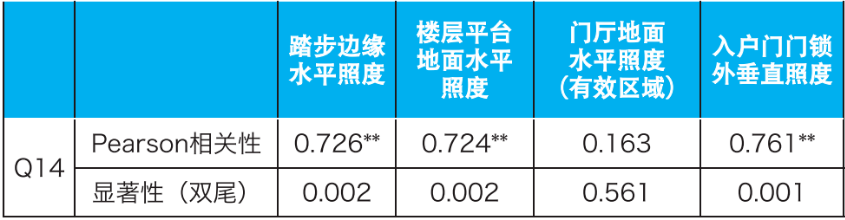 将Q14与各照明指标进行相关性分析(表12)。楼梯间整体照明满意度与踏步边缘水平照度、楼层平台地面水平照度、入户门门锁处垂直照度的相关系数大于0.7,呈显著正相关。与门厅地面水平照度(有效区域)无显著相关性。