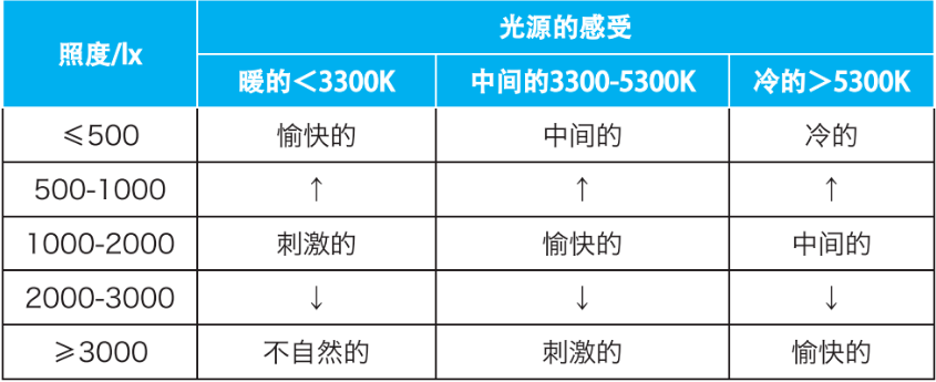 表1 光源色温与照度带给老年人的综合感受