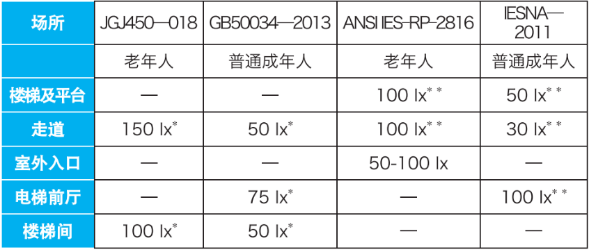 (1)我国仅对楼梯间整体的地面照度标准值进行说明。相比之下,美国针对老年人和普通成年人在楼梯梯段和平台处的照度都有说明。