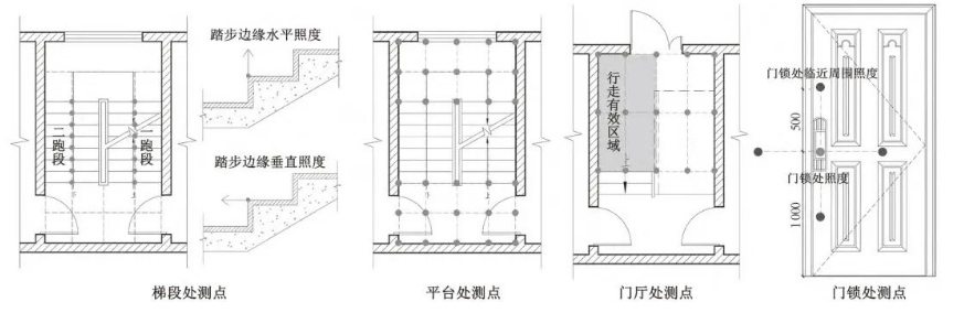 (3)照明参数指标:包括梯段处踏步边缘水平照度、垂直照度、楼梯平台地面水平照度、入户门门锁处垂直照度、门锁处临近周围照度、单元门门厅地面水平照度。