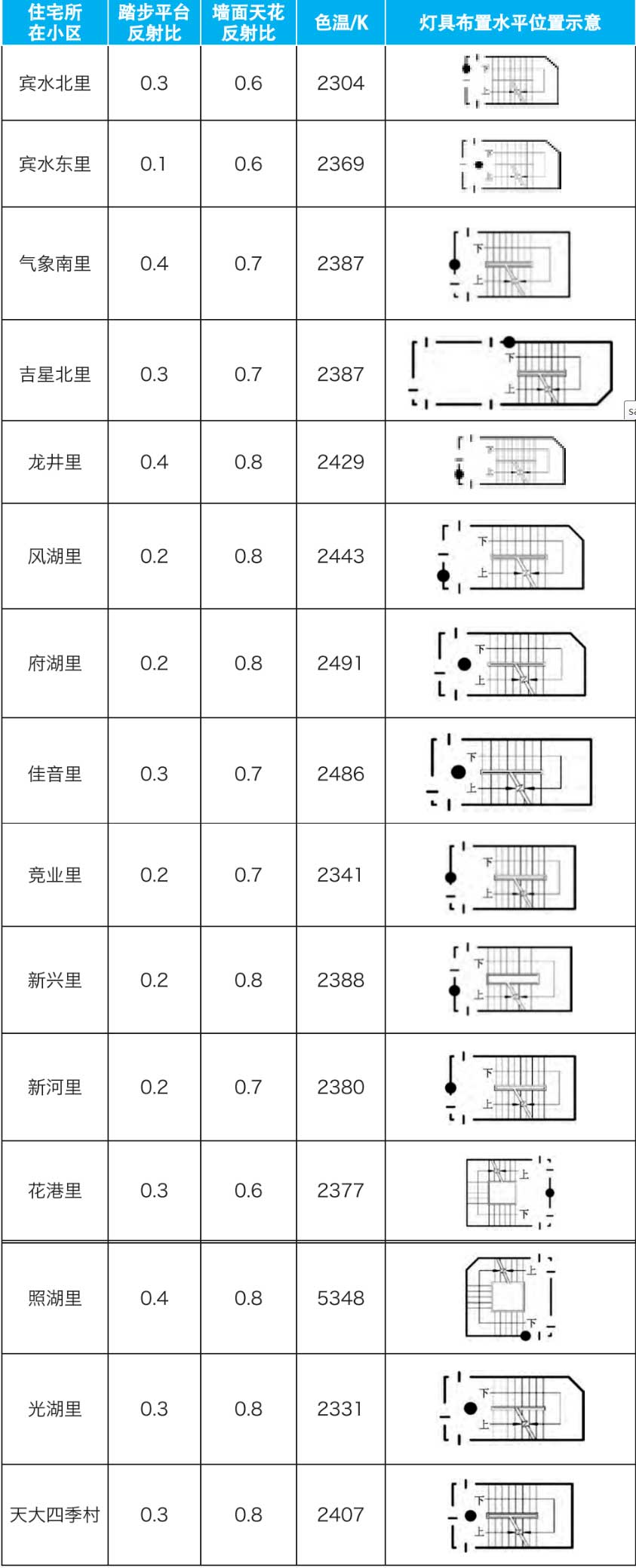 如表4所示,调研中踏步和平台均为粗糙水泥表面,墙面和天花表面材质为白色乳胶漆,因此踏步平台反射比均小于墙面天花反射比。光源类型方面,除照湖里楼梯间采用冷白色荧光灯,其余调研地点均采用暖黄色白炽灯,即除在照湖里测得色温为5348K外,其余地点所测色温均为低色温且差异不大。另外所有楼梯间都仅在楼层平台布置灯具,这其中又分为在天花处和侧墙布置两种,根据实地观察,在天花处布置灯具对整个楼梯平台照射更加均匀,而在侧墙布置灯具则容易出现照明死角且容易引起眩光。另外,楼层平台顶部存在管线外露情况,在一定程度上对光源产生了遮挡,影响了楼梯间内的照明效果。