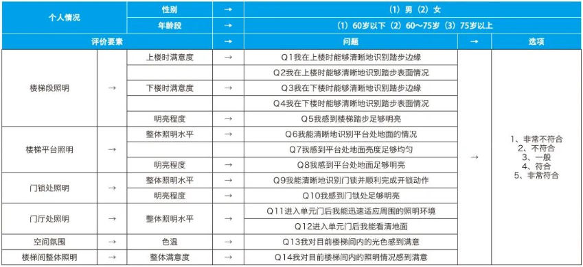 老旧住宅楼梯间调研指标分为照明空间指标、照明环境指标和照明参数指标。