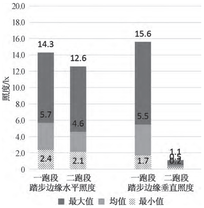 由于调研楼梯间均仅在楼层平台处布置灯具,因此在梯段处对各跑段分别统计。统计结果如图4所示。根据统计结果,各楼梯间踏步边缘水平照度、垂直照度差异明显,然而整体照明水平不高,两者的最大值仅为14.3lx和15.6lx。分跑段看,踏步边缘水平照度一跑段数值与二跑段差异不大。垂直照度则由于二跑段测点无直接光源照射,数值明显低于一跑段,最高仅为1.1lx。