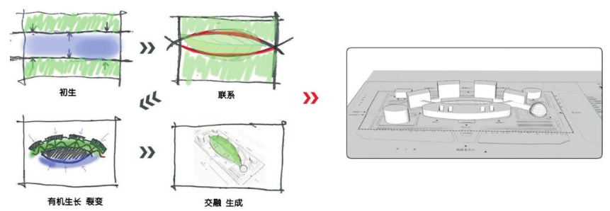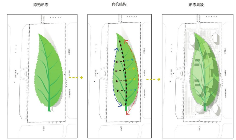 建筑设计方案从“叶子”出发,将医院的脉络结构沿“叶脉”展开,形成意象与功能流线相结合的简洁“图式”。该“图式”在二维角度为患儿提供可视化的形象指引,唤起儿童关于自然、绿色的美好记忆。