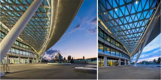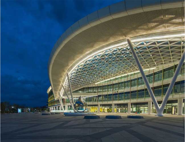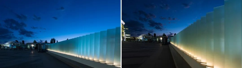 主入口最吸引人的为大跨度的钢结构玻璃雨棚,优美,圆润的造型在天空划过一道美丽的弧线。照明设计重点首先应该确保主入口功能性的照明,其次在雨棚的格栅中隐藏灯带,用间接照明的方式把弧线表现出来。