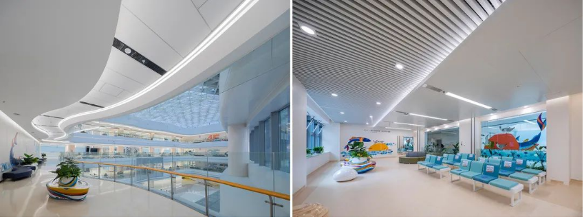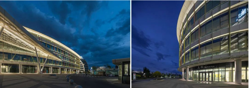 建筑设计在整个形态上表现出现代、简洁、柔和又不失大气,表皮为玻璃幕墙形式,红黄绿的彩色玻璃相间排列,增加了医院建筑的童趣感受,让建筑显得更有亲和力。建筑外观设计改变了以前人们对医院“严肃”“冰冷”的印象。因此,在照明设计中,我们也应该考虑怎样用灯光能将建筑的亲和形态表现出来,同时又不能造成灯光对室内的影响。