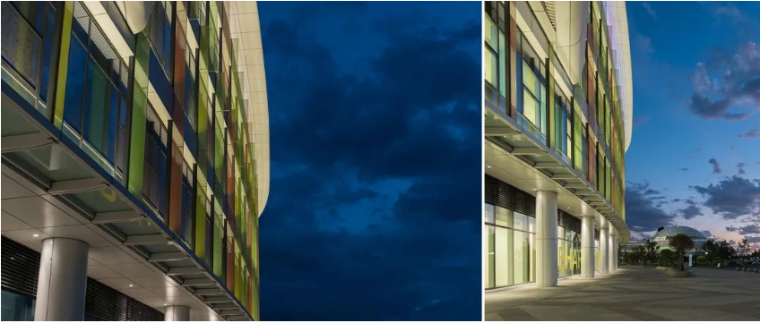 门诊医技楼的最大特点是立面条状的彩色釉点玻璃,我们希望用灯光强调彩色玻璃,增加立面丰富的色彩感受,但同时又需要考虑造价、受力、眩光等问题。通过多次的思考,我们采用了最简单的投光方式,经过投射与反射,高显色性的灯光把玻璃的色彩进行的强化,同时也加强了建筑整个的形态。