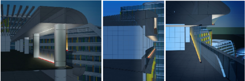 各个不同功能的建筑都由连廊相接,采用很间单的线性灯凸显出其桥梁的作用即可,另外,在连廊的底部嵌入射灯,对地面形成一定的照度,还能起到引导性的作用。