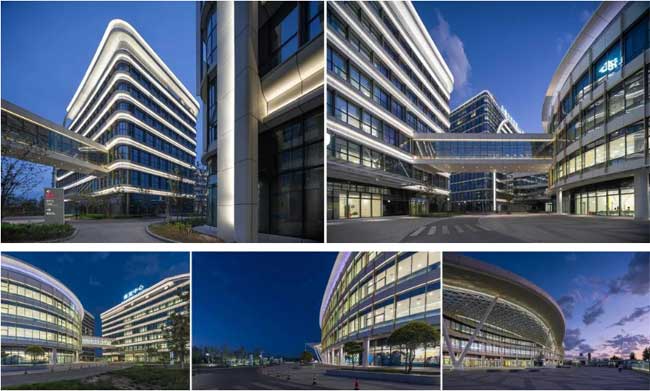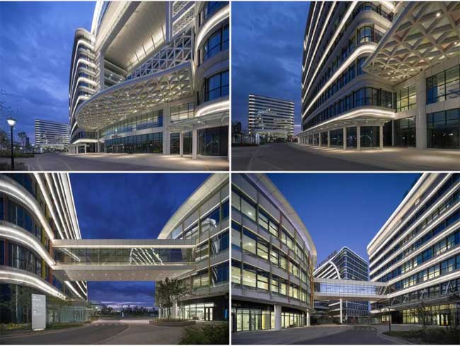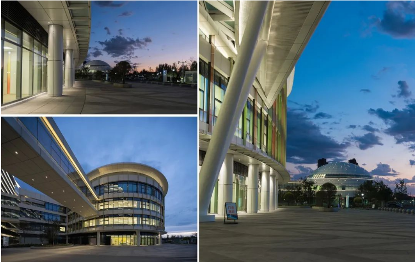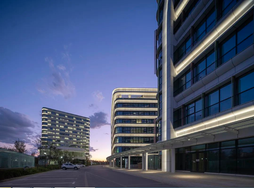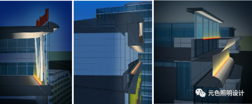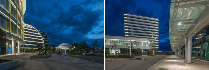 科研中心的照明,我们只在其四个转角布置了灯具,表现建筑的体块感,既能融入整个建筑群,同时又简洁的表现了本身的形态。