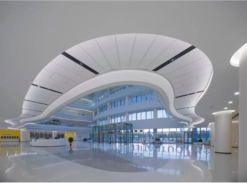 血液中心为办公性质,建筑采用了有弧度的横向装饰条,将灯具置于装饰条内,表现其转折的立体感,灯光通过装饰条的遮挡,光线也不会对室内造成影响。