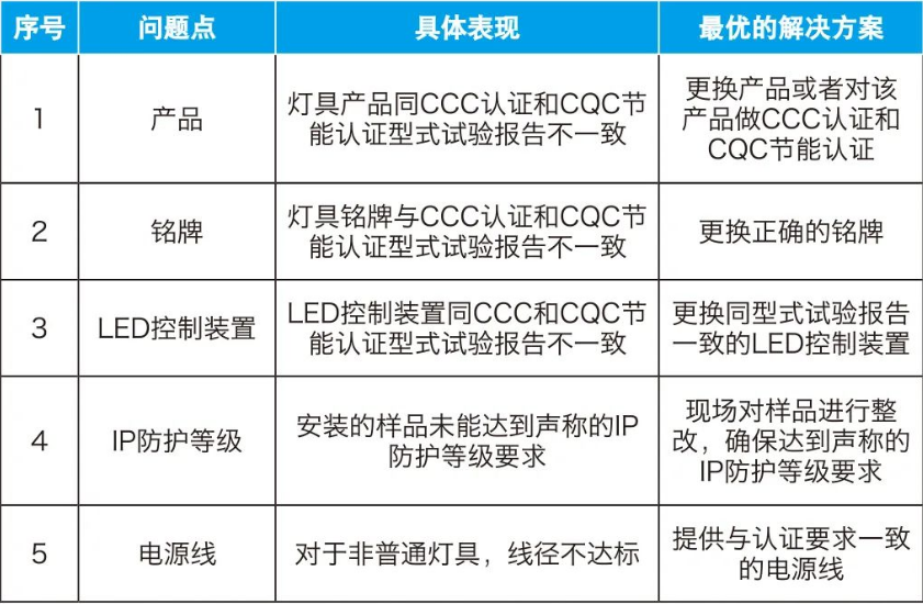 为了确保厂家安装到教室的灯具产品同型式试验报告中的产品一致,所以在建设教室优质照明光环境时增加了现场对产品进行一致性核查环节。但是,从申请该项目的十多家现场测试下来,产品一致性的问题很是多见,主要涉及的要点如表1所示。