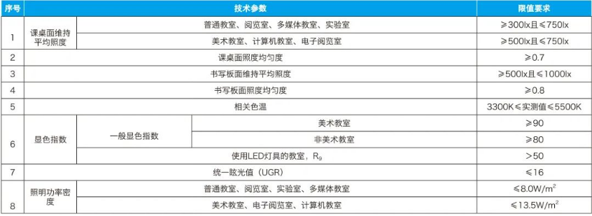 教室优质照明光环境指标包括课桌面、书写板面维持平均照度及照度均度、照明功率密度、统一眩光值、相关色温、显色指数等,具体限值要求见表2[3]。