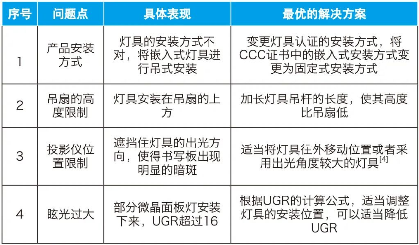 基于以上光环境要求,大多数厂家首先会根据自己产品的性能特点,结合教室现场设施(如空调、吊扇、投影仪、横梁等)情况进行布灯设计,然后再根据设计的位置进行施工安装,最后做细微调节,以达到最佳照明效果。但是,很多情况下会遇到一些不利于设计、安装的设施,具体表现如表3所示。
