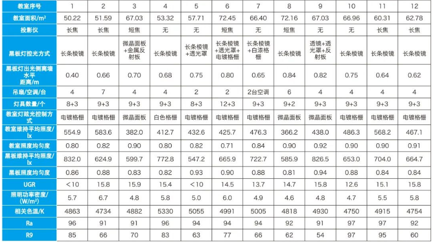 通过对不同地区、不同类型教室、不同灯具设计和安装的现场勘查和检测,让更多的人对教室光环境认证有了新的了解,并且通过以上的介绍和分析,读者可以根据教室的实际情况进行灯具的优化设计,同时也需要在灯具认证的基础上依据灯具的性能参数对教室现场进行较为合理的光环境设计和安装,只有这样才可以提供出更加优质的教室光环境。