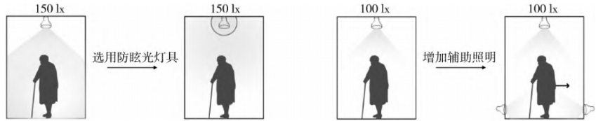 为帮助老年人看清楚物体,提升老年人的视觉性能,研究老年人的需求能帮助设计师在实际照明设计中有效处理老年人的视觉问题。通过提高白天日光照度或夜间的照度水平,达到提升老年人视敏度的效果。