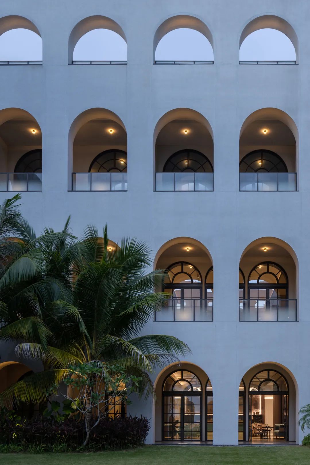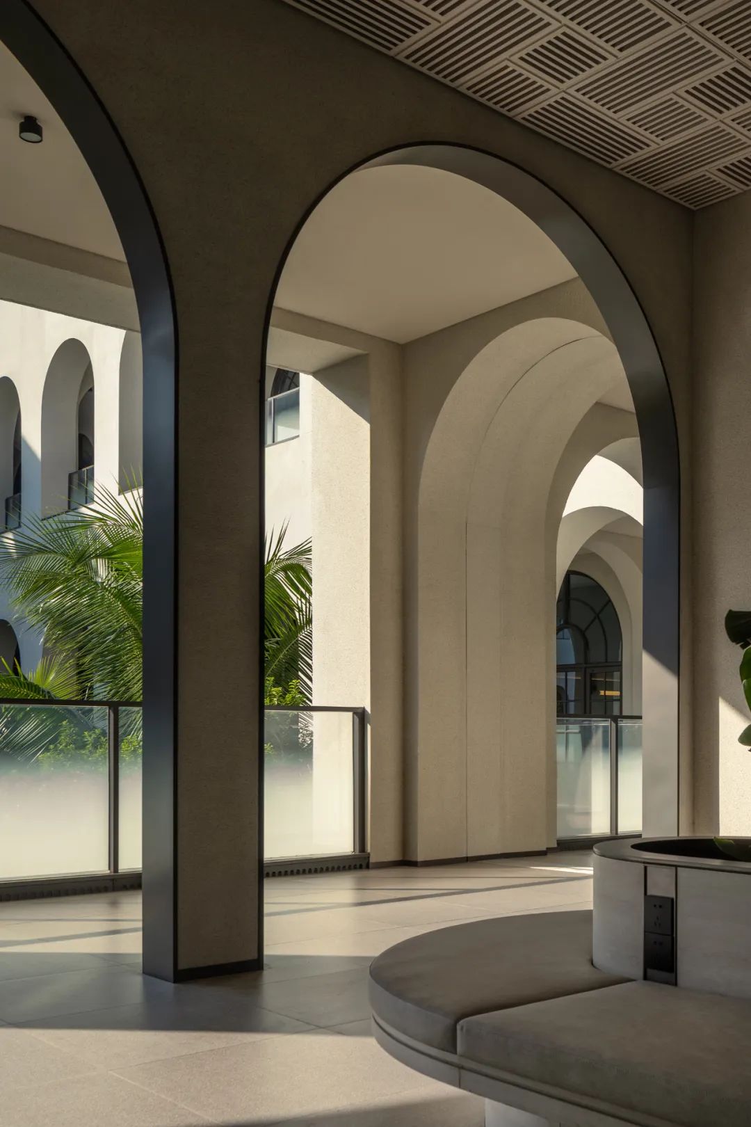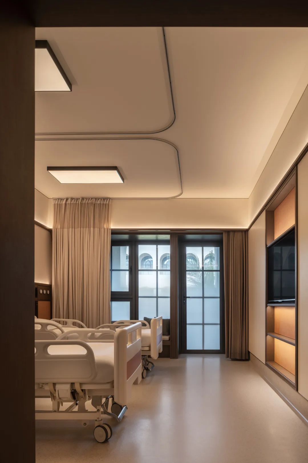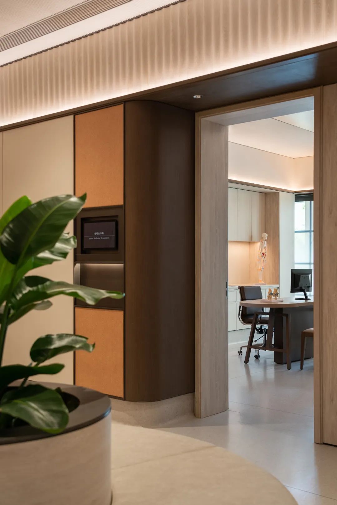 Albert Schweitzer made significant contributions to humanity based on his worldview of respecting life. He also reminds us that life is a sacred gift, and we should always approach it with gratitude and reverence. Hospitals, as places with a profound mission towards life, provide a holy symbol and the utmost space for inclusivity and compassion.融合中国「颐养」的智慧,坐落于海南博鳌的颖奕国际医疗中心,以让更多人享受更高的生命品质为初心。Integrating nurturing into Chinese culture, the ENHANCE INTERNATIONAL MEDICAL CENTER, located in Boao, Hainan, intends to enable more people to enjoy a higher quality of life. ✳︎三层的建筑体中,我们将接待放在2F,人流在此聚集。The reception is placed on the 2nd floor within the three-story building, where visitors are dropped off.Integrate multi-functional meeting space, cashier(Financial Center), and pharmacy on the 2nd floor.包括预防医学及慢性病管理中心、抗衰及医疗美容中心、干细胞免疫治疗中心、女性生育力保护中心、全人类细胞存储库、运动医学及康复中心,提供全方位的疗程服务,反映了其空间设计对医疗专业知识的高度需求。Comprising a Preventive Medicine and Chronic Disease Management Center, an Anti-Aging and Medical Aesthetics Center, a Stem Cell Immunotherapy Center, a Women’s Health and Fertility Wellness Center, a Cell Bank Center, and a Sports Medicine and Rehabilitation Center, it offers comprehensive treatment services, reflecting its high demand for medical expertise in its spatial design.The cell research center, the cell bank center因地制宜|Adaptation to Local Conditions颖奕国际医疗中心选择了在海南这特殊的地理位置,除了必备的专业医用功能,也被得天独厚的南国长年温暖气候包覆。This medical center has chosen its unique geographical location in Hainan, enjoying a year-round warm climate. 在建筑设计上我们以一大体量的围院式三层建筑为主体,围院为中国传统建筑中的智慧,在体量上除了可供医疗中心六大科室的使用需求,也保证了其私密性与充足的自然采光。四方有序而温和的拱形开窗立面,在大型建筑结构中兼容了理性与感性。The architectural design centres around a large three-story courtyard-style building, drawing inspiration from traditional Chinese architecture. This design not only accommodates the needs of the six central departments of the medical center but also ensures privacy and ample natural lighting. The orderly and gentle arched windows on all sides balance rationality and sensibility in this large-scale structure. 而扩大的回廊式的环绕动线,从传统围院建筑中提炼,更适应了海南气候的特性,兼具挡避风雨侵袭、炎阳照射;创造出外、中、内不同的动线层次;分散了各个医疗科室的移动人流,也创造出新的活动区域。The expanded corridor-style circulation system, refined from traditional courtyard architecture, adapts well to Hainan's climate, offering protection from wind and rain and ample sunlight. It creates distinct circulation levels outside, in between, and inside the building, dispersing the flow of people in various medical departments and generating new activity areas.因医疗中心特殊性质,不需要医院典型的分诊功能。室内设计采用大量弧形元素、木质装饰、温暖的色彩、人造绿化等,为所有访客创造了温馨而舒缓的视觉体验。Due to the nature of the medical center, there's no need for the typical triage function of a hospital. The interior features curved elements, wooden accents, warm colours, artificial greenery, and more, creating a welcoming and soothing visual experience for all visitors. 摆脱了传统医院空间中仅有的理性与冷静,我们希望在整个医疗旅程中,我们将中国传统养生智慧的“颐养”理念融入到设计中,以更灵活、更因地制宜的方式,打破既定医院冰冷专业的刻板印象,融入中国南方风情的独特魅力。It moves away from the conventional clinical and sterile appearance. Throughout the medical journey, we incorporate the concept of "health preservation" from traditional Chinese health wisdom into the design. The design concept is flexible and site-specific, breaking away from the stereotype of cold professionalism and incorporating the unique charm of Southern Chinese culture.