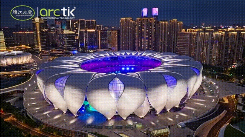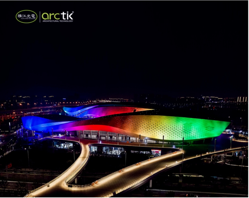 宁波奥体中心是宁波市的标志性建筑之一,位于浙江省宁波市江北区前江街道,集体育赛事、文化演艺、全民健身、企业活动、国际交流、专业训练为一体的大型综合性体育中心,场馆外立面亮化选用了雅江光电旗下品牌ARCTIK数千台炫彩泛光25,体积小、能量大、混色均匀的特点,与奥体中心的建筑融合一起。
