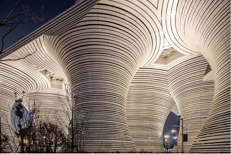杭州蜻蜓公园未来停车场的照明设计从现代异形建筑形体出发,旨在通过灯光的光影关系以及点、线、面、体的手法运用,表达出建筑夜晚的空间层次与韵味。创造一个集功能性、艺术性、宣传性和可持续性为一体的夜间光的艺术地标。当夜幕降临,采用了上百台雅江光电曜彩投光400,实现光艺术空间,为蜻蜓公园提供了独特的灯光氛围。