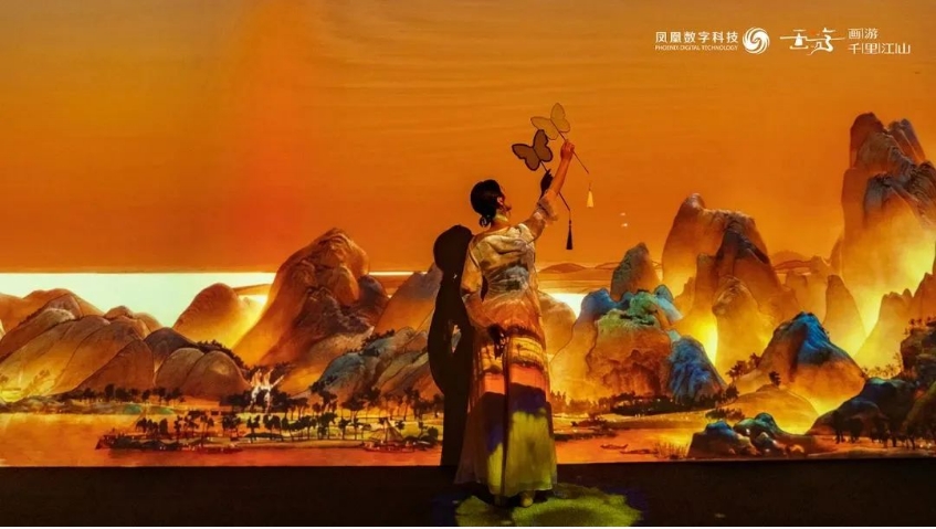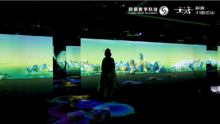 《画游千里江山——故宫沉浸艺术展》由凤凰卫视旗下核心板块、中国数字创意产业领军品牌凤凰数字科技主创,创意团队秉承“以科技赋能传统文化,向世界讲好中国故事”的理念,运用高清数字投影技术,结合装置艺术与诗意乐韵,对《千里江山图》这一青绿山水巨制杰构进行跨界艺术探索,为公众呈现一场非凡的沉浸式光影艺术体验。
