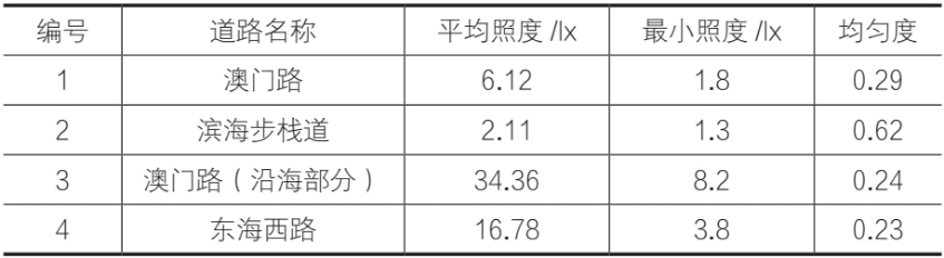 青岛浮山湾沿海区主要路段道路照明所进行的调研及测试结果如表2所示。