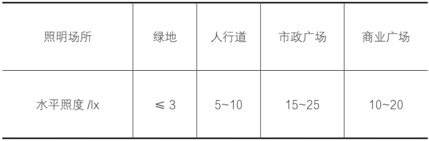 表3 绿地、人行道、公共广场区照度标准值
