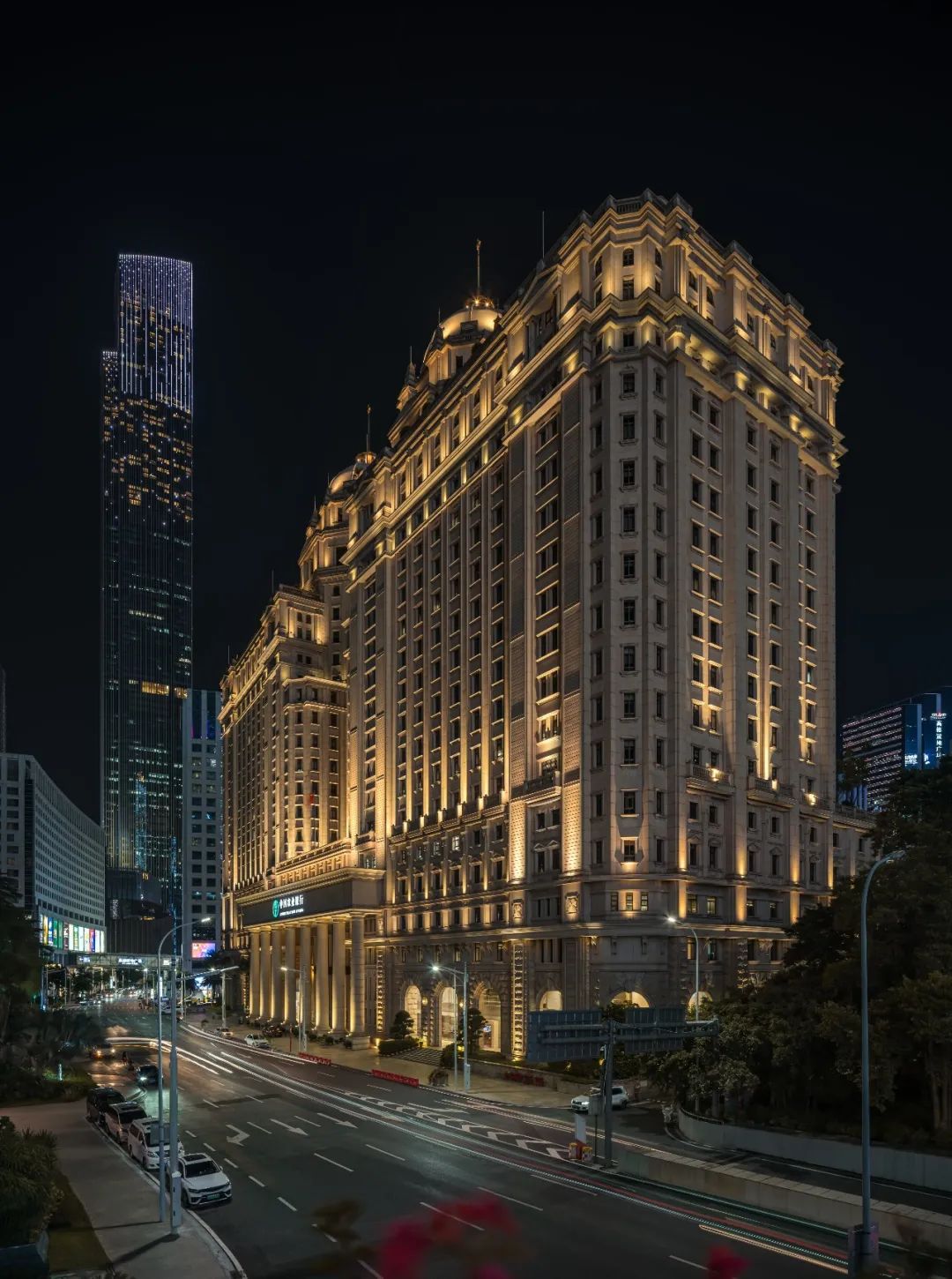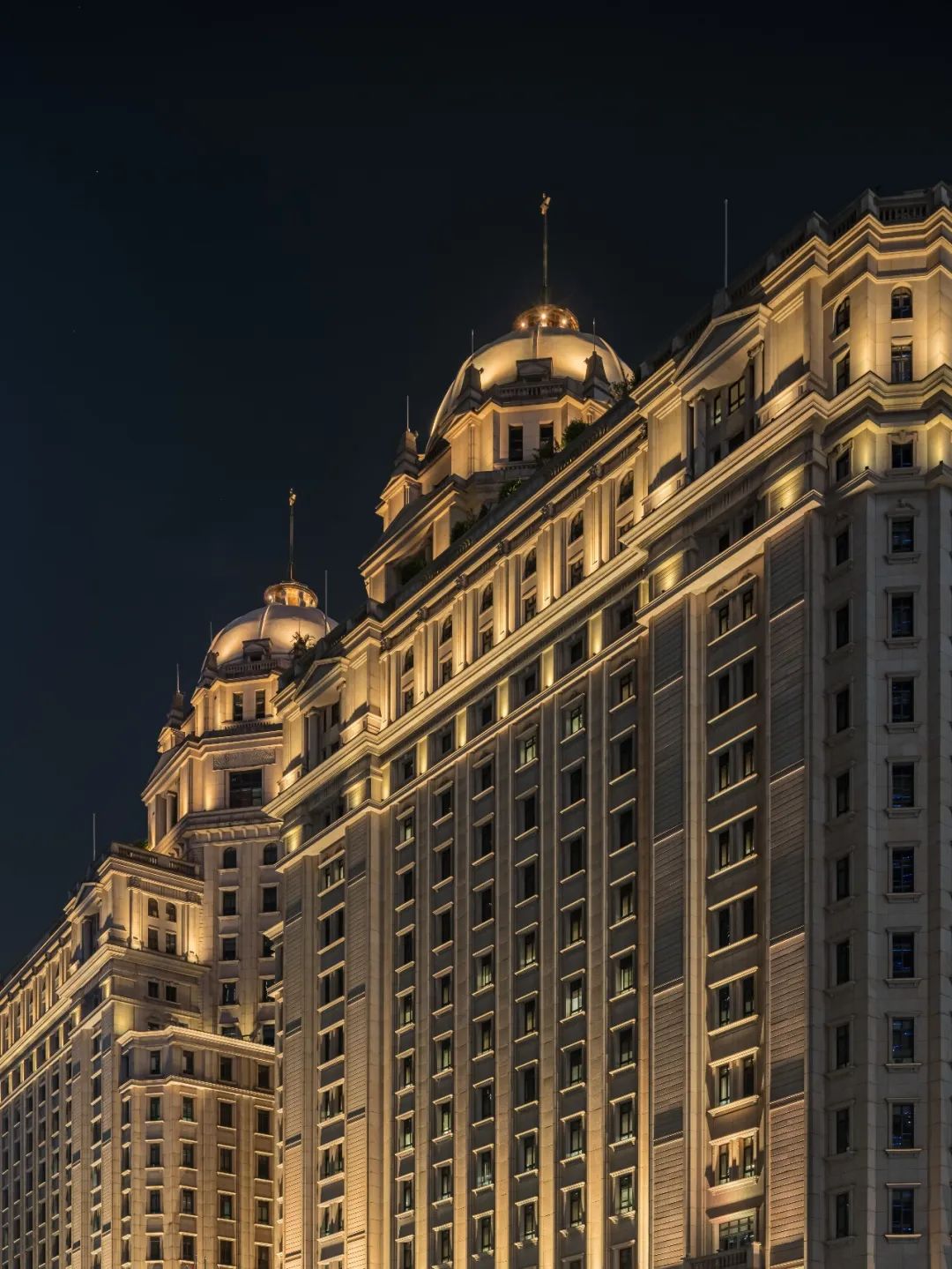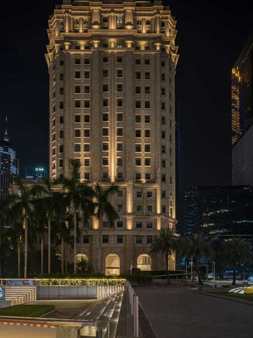 随着时间的推移,一些灯光设备开始老化了,线路陈旧了,系统落后了,效果参差不齐了。因此,作为改造策略,就是更换高能耗的老旧设备,采用新技术节能产品,升级系统,在新产品的逻辑下提升表现效果。如一致性,柔和度,与材质匹配的色温,与细部相应的配光角度,尽可能隐藏灯具设备,还原外立面的本体效果。所谓可持续维持是要保持既有的大致格调,所谓更新就是随当下审美认知对效果的进一步提升,这个度其实是专业的度,找准适合的度才是可接受的最佳状态。▲在既有的核心区夜景氛围中维持了投资大厦应有的夜色样貌,与标志物广州塔,东西塔相辉映。广州珠江投资大厦是珠江新城核心片区的一栋欧式风格大厦,在东西塔,小蛮腰等的地标下属于沉稳厚重的风格。表面石材,过去的照明方式是按照载体风格采用投光的照明手法,只是用了金卤灯光源,属于上一代照明设备产品,能耗高,体积大,光照不细腻,细节少,对昼间建筑外观有影响。我们认为对该建筑灯光做更新的原则基本不应该大幅度改变既有外观印象,只是做进一步精细化设计,更新产品设备,系统,优化节点,弥补效果的不足。从屋顶,到立面叠涩,转折装饰,线脚,依欧式古典的三段式特征平衡整体灯光亮度对比度,观感,用光影塑形表现。