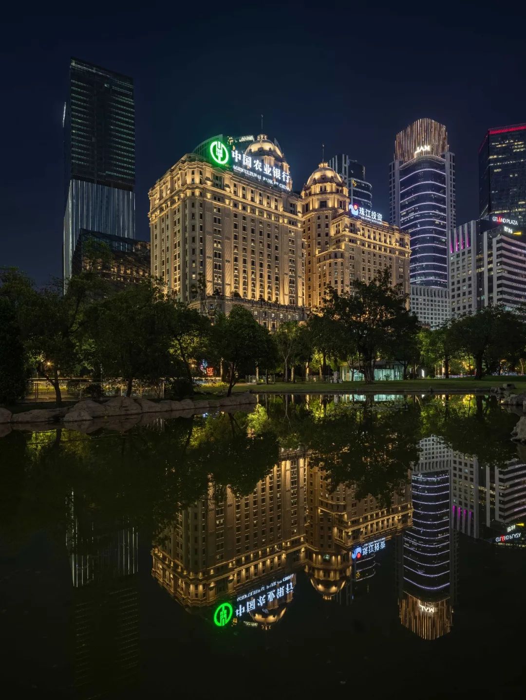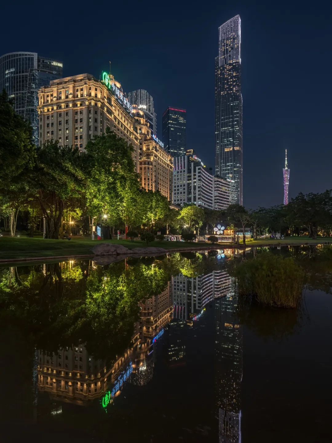 ▲在高楼林立的环境中,投资大厦的存在感仍然很强,暖色光,古典感,增添了珠江新城夜色的丰富性。