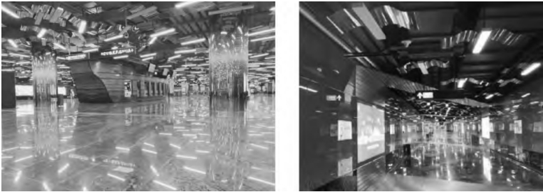 地铁空间中不同的灯光布置方式也会塑造不同的空间形态,常用的艺术照明布置方式为点式照明、线式照明、面式照明。