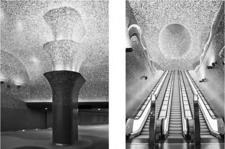 艺术照明在地铁空间中的设计语言多种多样,不同的灯光色彩、投射方式、灯具造型等形成不同的空间氛围。通过各种形式,将其应用于地铁空间,创造全新形态、更高审美层面的公共艺术交通空间。