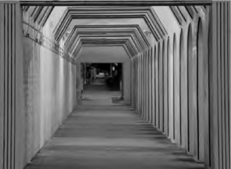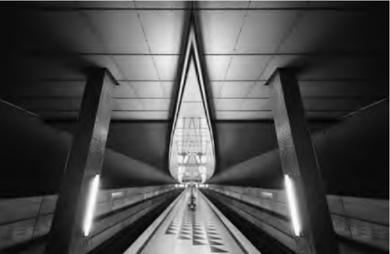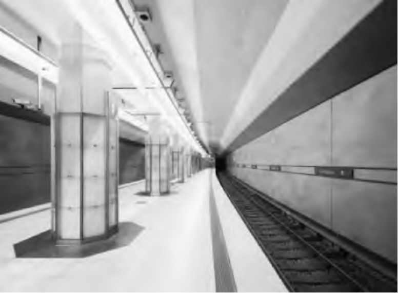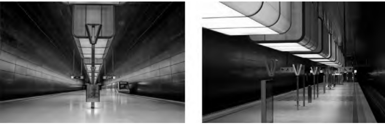 2)线式照明。利用线性灯具或排列方式引导空间,使空间具备极强的张力和节奏感。如,北京奥林匹克公园站在天棚设置几何线性的灯带与地面线性的铺装相呼应,增强空间的横向延伸性,同时又做了一点小小的曲折变形,让空间富有节奏感(见图11)。又如,慕尼黑Westfriedhof地铁站利用站台层规则的空间形态将灯光从天棚顶部向两端横向平行照射,使其光束折射于两侧立面墙上,从而达到虚像的空间景深感,人在其中如同穿梭于时空隧道(见图12)。