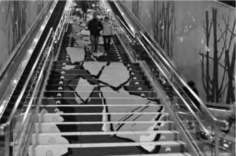 2)另一种渲染空间色彩的方式则是以灯光自带的颜色来烘托空间氛围,如美国亚拉巴马州伯明翰地下通道(见图7),全通道由计算机化LED照明系统控制,在长达百米的通道中,颜色可以变换,形成渐深视觉效应,成为一个新的艺术互动点。又如重庆小龙坎地铁站(见图8),站内以“森林”为主题,扶梯上暗藏蓝色灯带,与墙面的树林、地面的树叶图案结合,营造静谧、悠扬的空间意境。