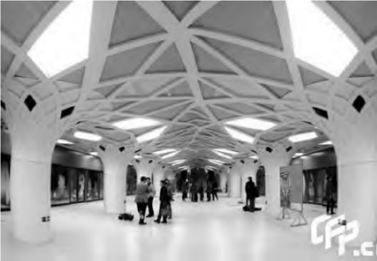 又如意大利那不勒斯的Toledo地铁站(见图2),空间中无数蓝白马赛克错落布置在墙的上半部分及顶面,下半部分及地面用纯蓝色描绘夜间的深邃。LED灯以点状的方式投射在上空,轻盈的穹顶被照射得更加明亮与迷幻,同时顶面的;“繁星点点”又被反射到地面。过路的乘客走到这里仿佛在太空中遨游一般,一天的疲惫顿时消失殆尽。