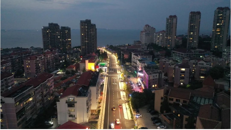 圆百姓“安居梦”,筑民生“幸福巢”,实现社区和街区的移步换景。海韵路位于老城区,临近老旧社区,道路照明改造提升,将单一的功能照明升级景观照明,将城市特色和文化景观相融合,配合街区绿化和精致小品,有效提升周边社区环境,改善老旧社区面貌,为城市建设增添了一抹亮色。