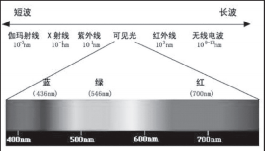 在商业展示空间设计中,要充分考虑人的视觉阈限性、光谱敏感性。人类数百万的视锥细胞按其光谱敏感性可分为3类,分别对红光、绿光、蓝光有最佳反应。在光谱中波长最短的是紫色,最长的是红色,人眼识别不了的则是光波以外的紫外线和红外线(见图4)。当人处于较暗的环境下时对光谱中波长较长的光的亮度阈限值要求相对高一点,比如红色和黄色,而对光谱中波长较短的光的亮度阈限值要求相对较低,比如紫色。