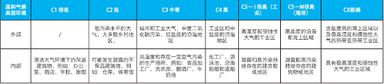 我国地域宽广、气候复杂,地理气候的差异对大气腐蚀的影响很显著。国际上广泛应用的标准ISO 12944-2:2017[3]规定大气腐蚀性环境分类是进行防腐设计和产品选择的基础,见表2。