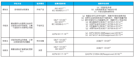 盐雾试验评定是衡量耐盐雾质量的关键,评定方法取决于选择的标准、试验产品、试验条件、客户要求等因素,见表6。