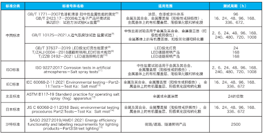 盐雾试验的核心是加快试验的腐蚀速度并使其试验结果与产品真实的应用环境对材料的腐蚀作用类似,国内外盐雾标准仅推荐常见的试验周期,多为24h的整数倍,应根据不同环境腐蚀等级制定不同的试验周期。如道路照明不低于168h的中性盐雾试验被验证能满足一般气候条件要求,但对于含盐度高的沿海区域以及极高湿度和侵蚀性大气的地区,则应调整试验周期。