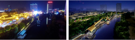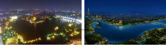 图4 凤城河景区特色照明区(左-夜景现状照片;右-规划效果图)